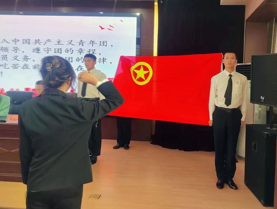 商学院2022级工商管理三班王伟代表新团员发言。数学与统计学院2022级数据科学与大数据技术一班王锦代表老团员发言。资源与环境工程学院2022级环境生态工程班张倩带领全体新团员在团旗下庄严宣誓。