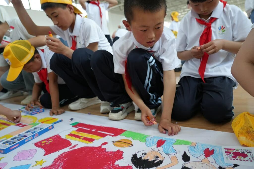 在美术与设计学院,大学生哥哥姐姐和同学们“大手牵小手同画一幅我爱祖国长卷画”,他们用手中的画笔,描绘出对党和祖国最童真的爱。