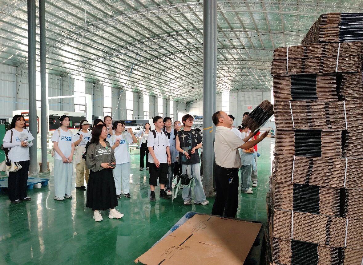 调研首站,实践团队抵达位于藉口镇三合村的天水藉盛包装制造项目。在现场负责人的专业讲解下,团队成员详细观摩了高效运转的果蔬包装自动化生产线。现场负责人介绍道,该项目秉持“生态环保、集约高效、联农带农”发展理念,致力于打造服务于本地林果产业的自主包装品牌,填补了区域高端包装产业空白,是产业链补链强链的重要举措。团队成员通过现场介绍,深刻认识到,现代化智能设备的应用已将农产品包装环节提升至产业链的核心竞争层面。