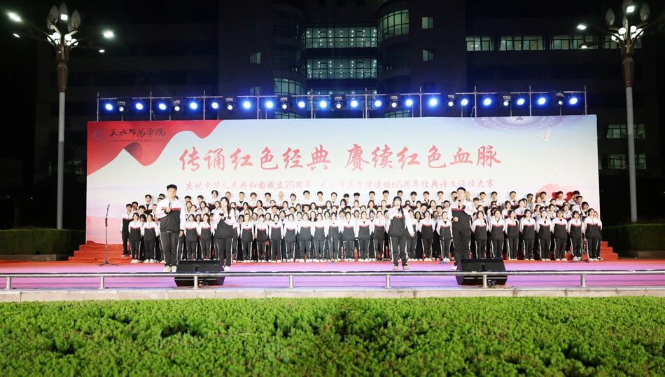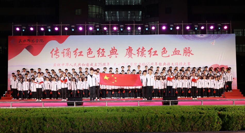 为深入学习贯彻习近平新时代中国特色社会主义思想、习近平总书记在全国教育大会上的重要讲话精神和关于红色文化育人、语言文字工作的重要指示批示精神,引导青年大学生筑牢信念之魂、理想之基,传承好红色基因,弘扬好中华优秀传统文化,9月26日晚,学校在文化广场举办“传诵红色经典 赓续红色血脉”庆祝中华人民共和国成立75周年、天水师范学院建校65周年经典诗文诵读大赛。党委常委、副校长汪咏国,党委常委、宣传部部长、统战部部长武胜文,教务处、党委学生工作部、马克思主义学院、校团委负责人,各学院分管学生工作院长、分团委书记、辅导员,学校军训团全体教官,2024级全体新生共3300余人参加。