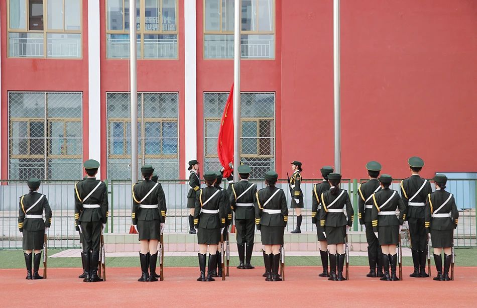 伴随着雄壮的《义勇军进行曲》,鲜艳的五星红旗冉冉升起,全体师生肃立行注目礼,高唱国歌,深切表达对祖国的崇高敬意和热爱之情。