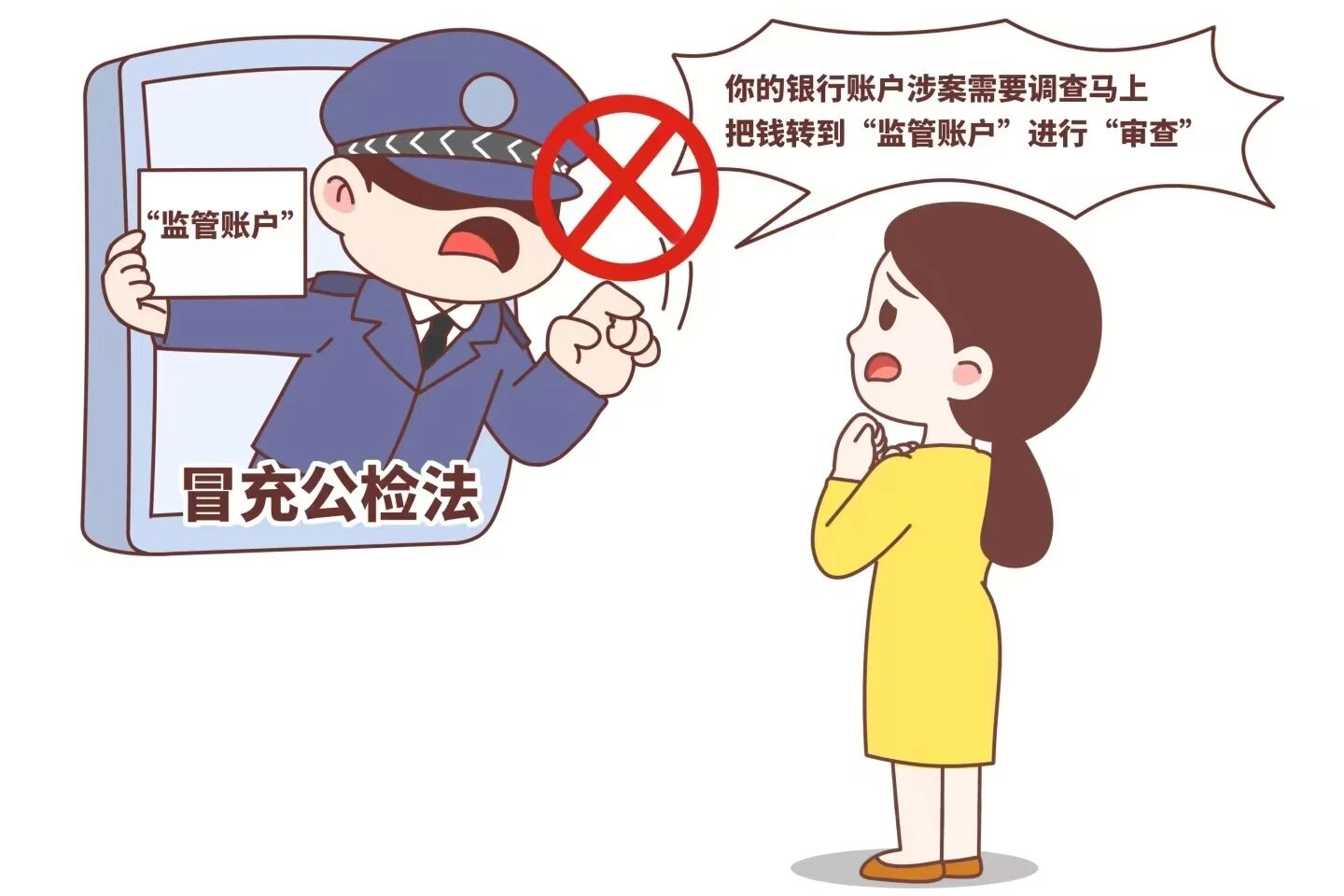 “冒充公检法”诈骗要识破,凡是要求将资金转入“监管账户”配合调查的,均为诈骗,切勿转账。